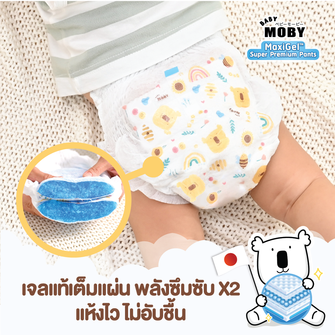 Baby Moby ขอแนะนำ แพมเพิสที่ตอบโจทย์ความต้องการของคุณแม่ ลูกใส่แล้วสบายตัวไม่อับไม่ชื้น ด้วยเทคโนโลยีเจลแท้เต็มแผ่น ซึมซับไว ระบายอากาศได้ดี ไร้กังวลเรื่องการอับชื้นและมีแถบสีมาให้เพื่อให้คุณแม่เช็คสะดวกสบายเมื่อถึงเวลาเปลี่ยน